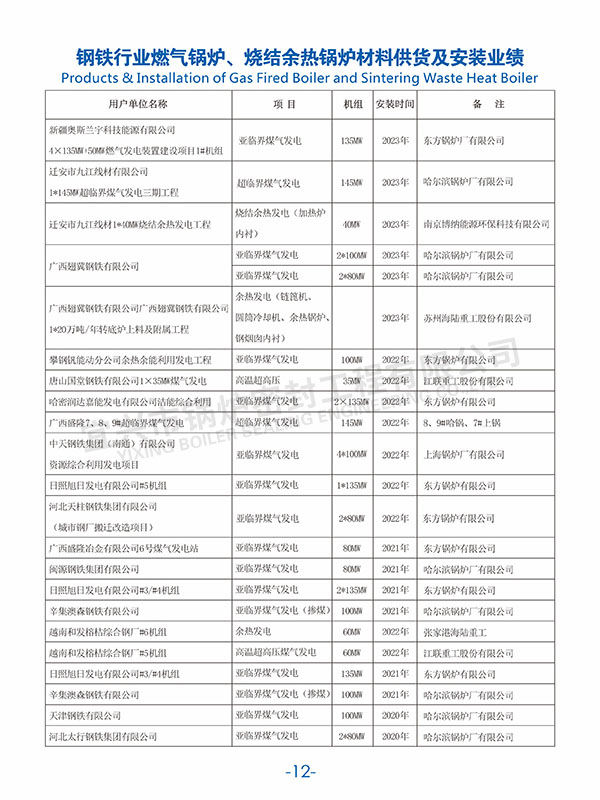鋼鐵行業燃氣鍋爐、燒結余熱鍋爐材料供貨及安裝業績(一)